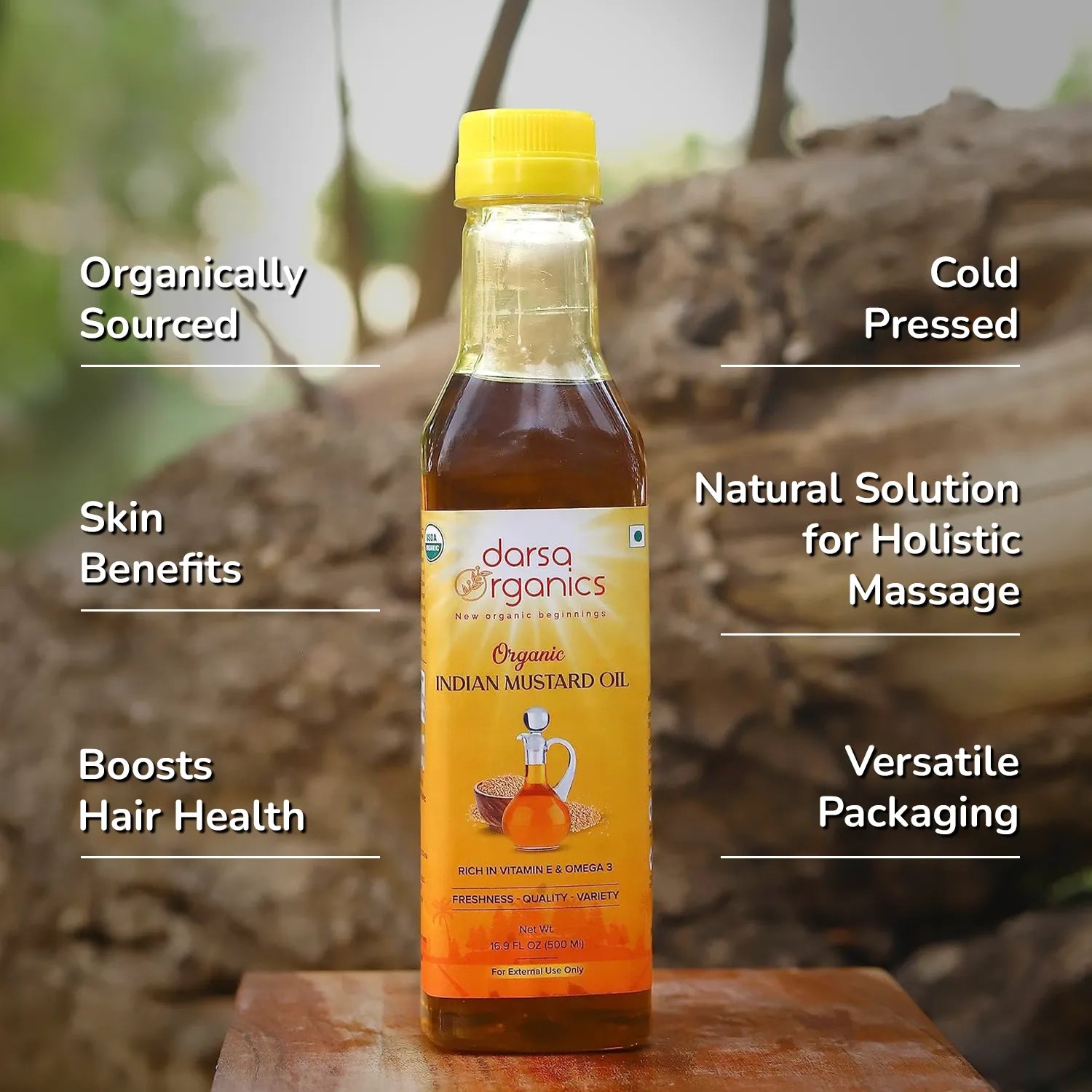 - Skin Benefits: Darsa Organics unrefined mustard oil is rich in Vitamin E and Omega-3, which can improve skin tone with regular use. The Kachi Ghani mustard oil can be easily blended with moisturizers, essential oils, and body washes of your choice.