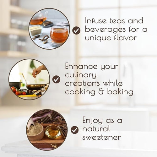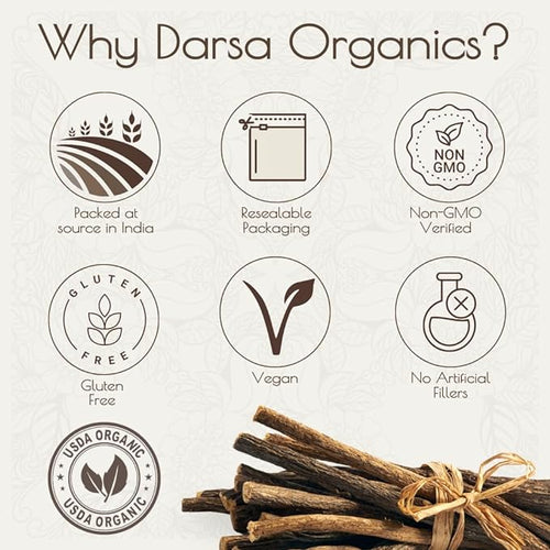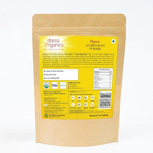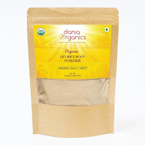 Our Organic Licorice Powder, also known as Mulethi Powder (botanical name: Glycyrrhiza glabra), is a premium-quality herbal supplement made from sun-dried licorice root, finely ground for easy use. Ayurveda and traditional herbalism uses licorice for its powerful soothing, anti-inflammatory, and adaptogenic properties. Sustainably sourced from organic farms this USDA Certified organic herbal powder supports digestive comfort, respiratory health, skin clarity, and overall vitality.
