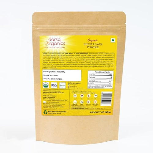 - ORGANICALLY SOURCED: Darsa Organics Stevia Leaves Powder is sourced from the fertile regions of India. Following the global standards for organic farm produce, our stevia leaves are cultivated without harmful chemicals. The herbal supplement undergoes a rigorous quality inspection to ensure the highest levels of purity and is USDA-certified organic.