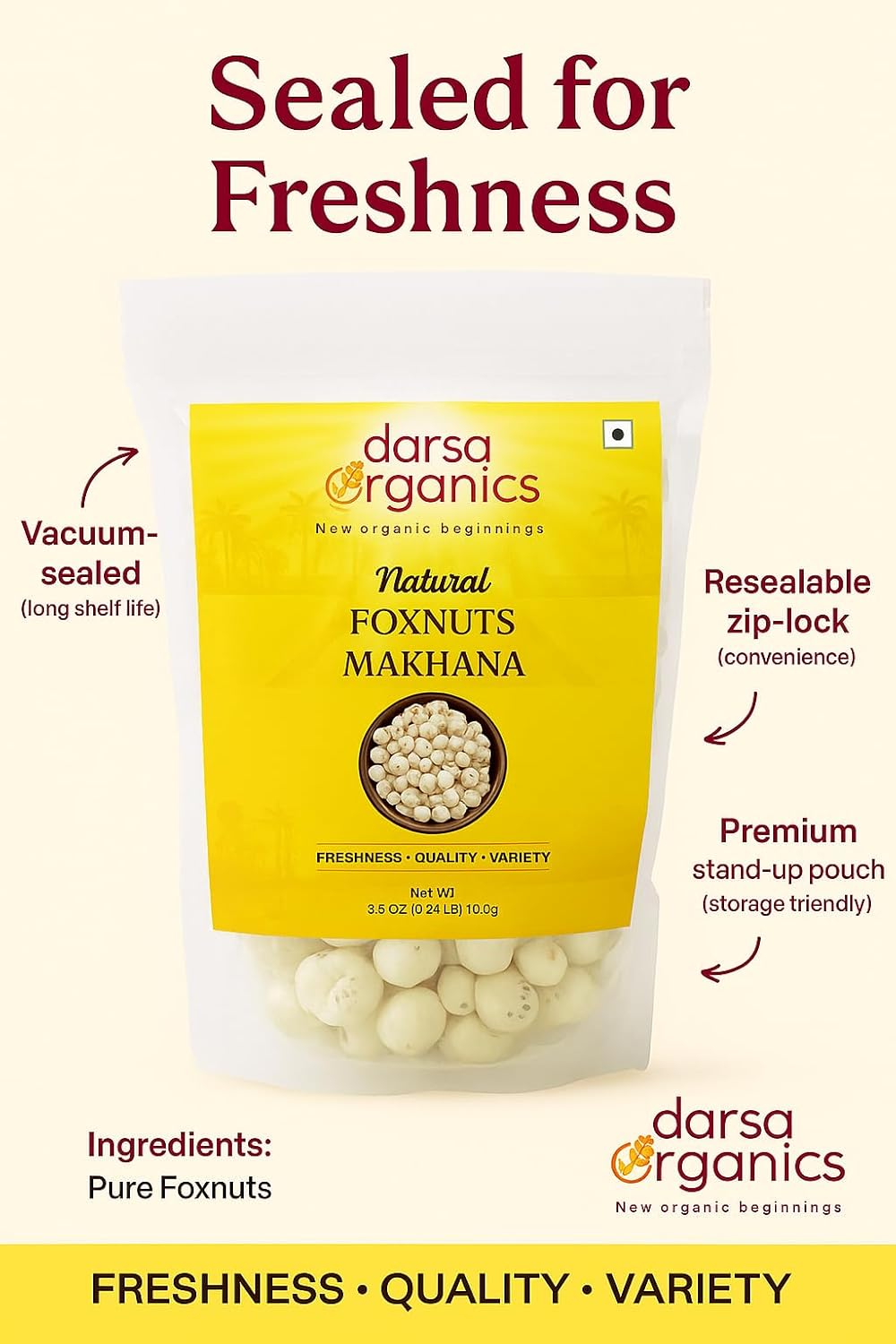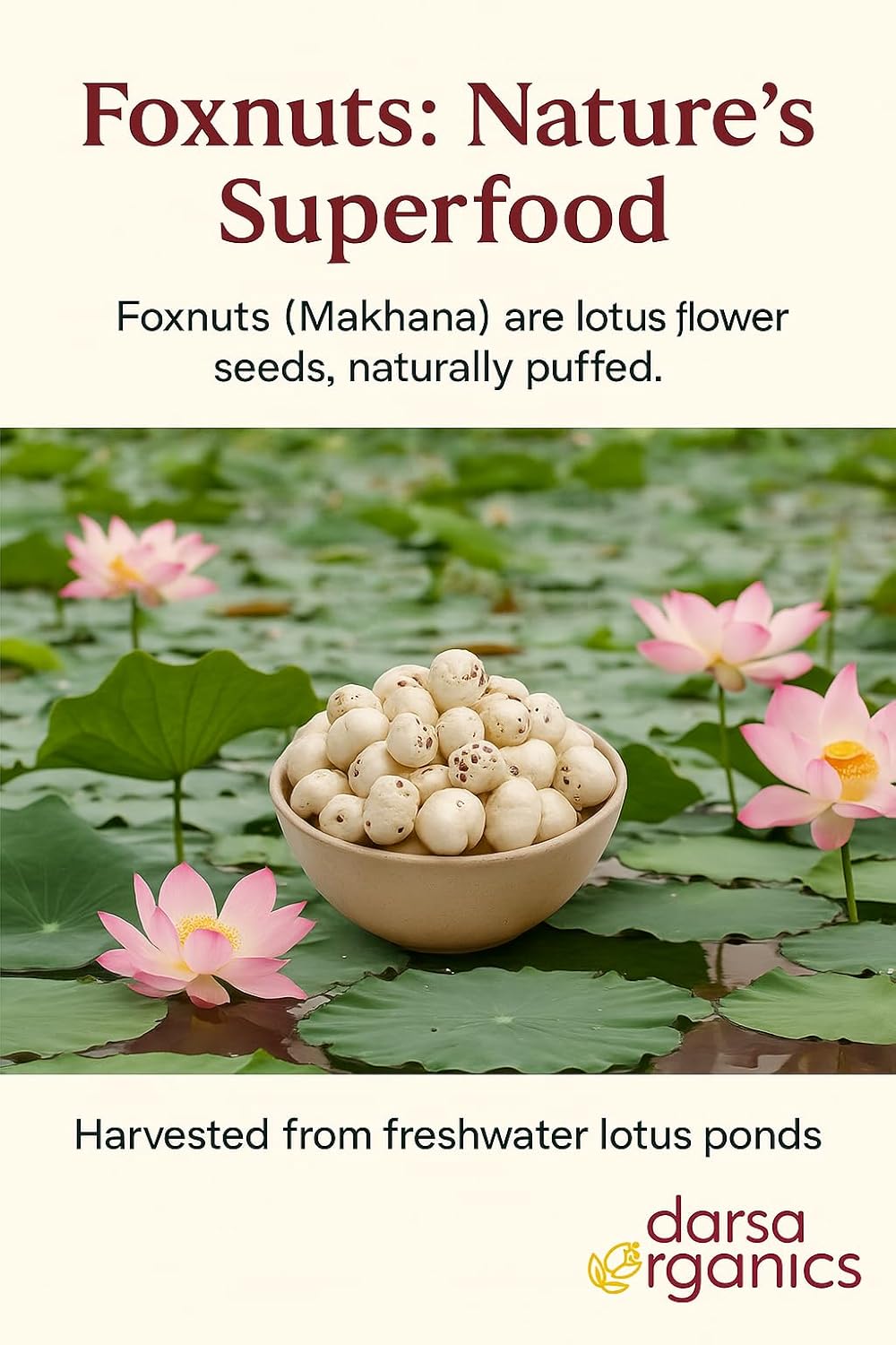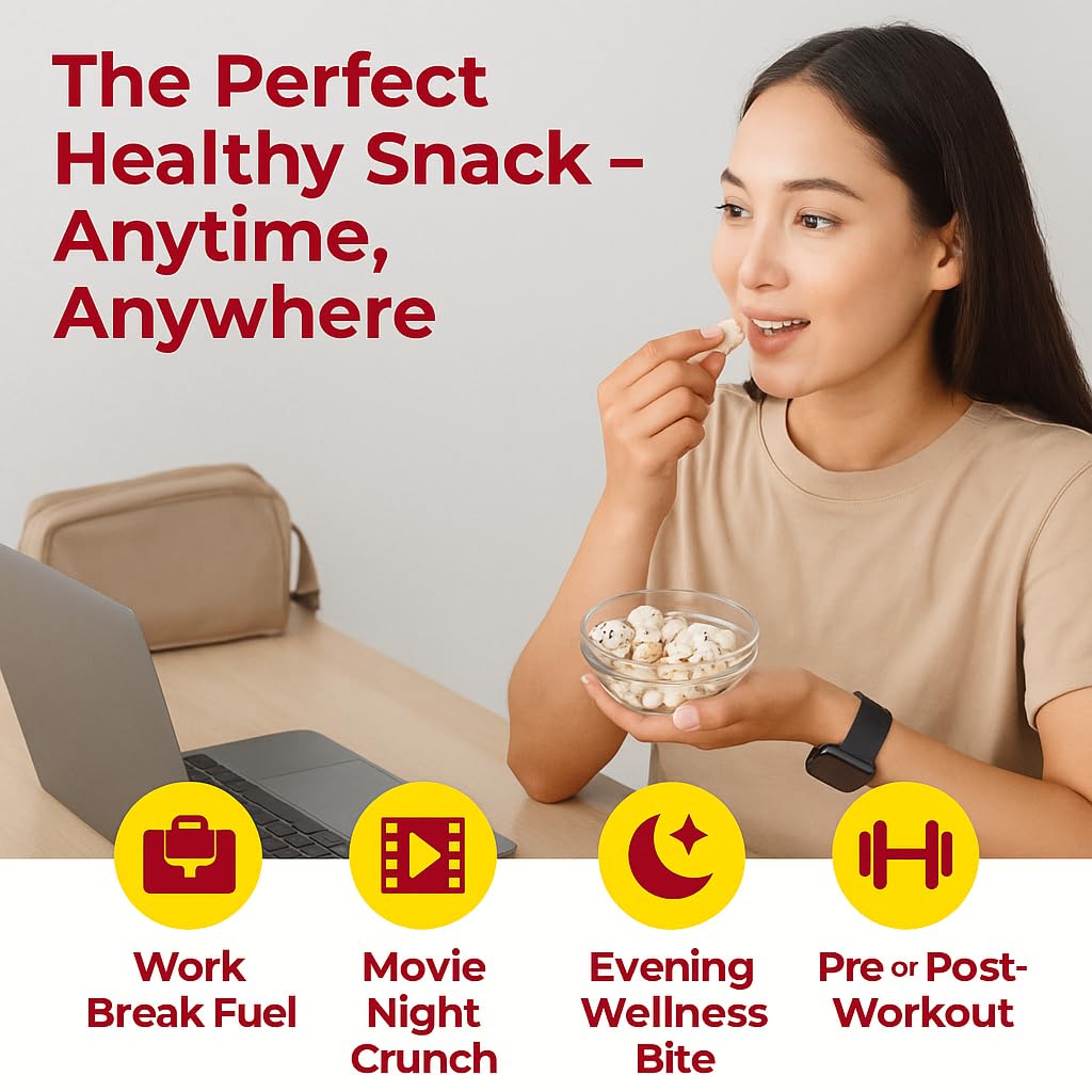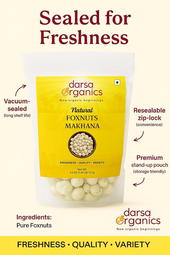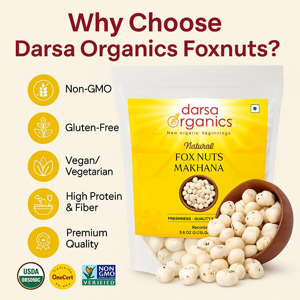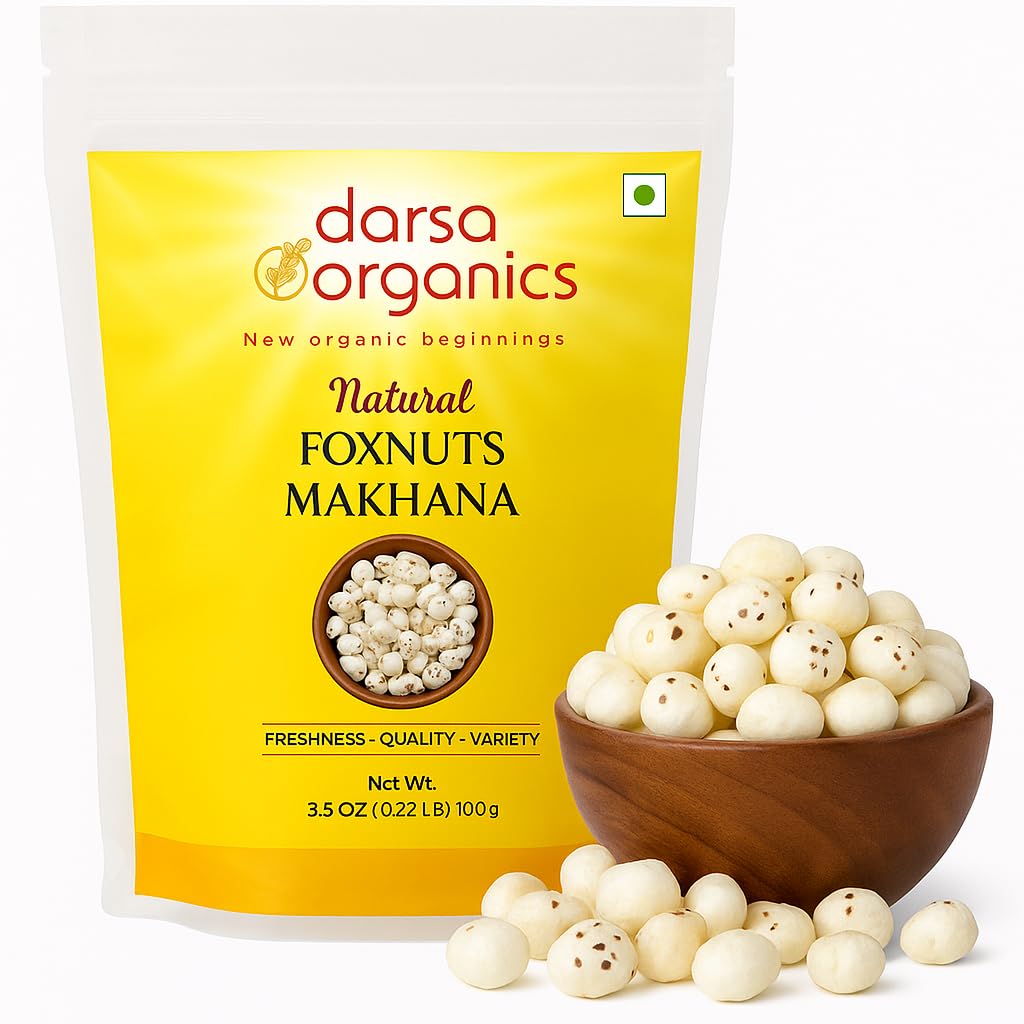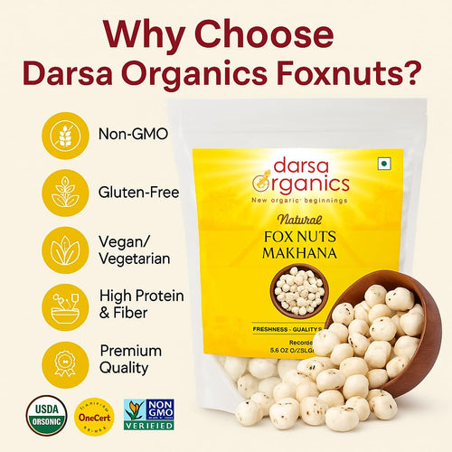 Our premium foxnuts are carefully sourced and hygienically packed to preserve their natural freshness, crisp texture, and delicate flavor. With no artificial additives or preservatives, they deliver a clean, authentic snacking experience you can trust. Foxnuts are low in calories and fat, yet rich in plant-based protein, dietary fiber, magnesium, and antioxidants, helping support balanced nutrition and everyday wellness. Their light, airy crunch makes them highly satisfying without the heaviness of processed snacks, making them ideal for weight-conscious diets, fitness routines, and active lifestyles. Versatile and easy to use, these lotus seeds can be roasted with spices for a delicious roasted makhana snack, added to curries, kheer, trail mixes, salads, or soups, or enjoyed plain as a guilt-free snack. Whether you’re seeking a healthy alternative to chips and popcorn or a traditional superfood with modern appeal, Darsa Organics Pure Foxnuts deliver quality, taste, and nutrition in every bite.