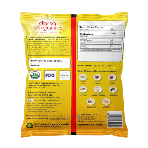 - PROMOTES HEALTHY LIFESTYLE: Darsa Organics Masoor dal is an ideal choice for people conscious about their daily nutrition intake. This non-GMO lentil contains proteins, calcium, potassium, and iron. The Organic Pink lentil whole is a great source of dietary fiber, contributing to your daily nutrition intake.