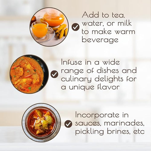 - Earthy & Lightly Spiced Flavor: Organic turmeric can improve the flavor profile of curries, pickles, marinades, or beverages. The peppery spicy taste with an earthy pleasant aroma makes it a popular ingredient used in most Indian cuisines.