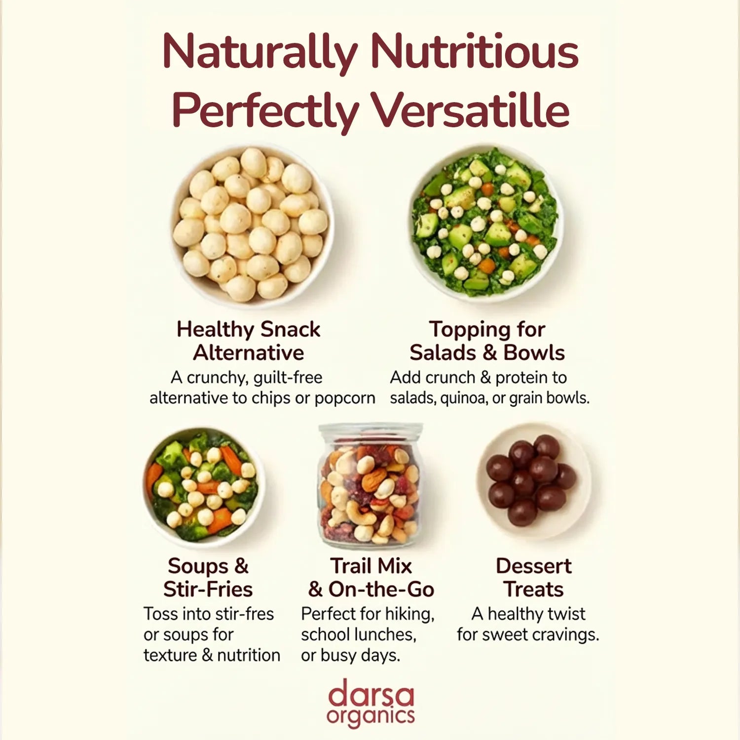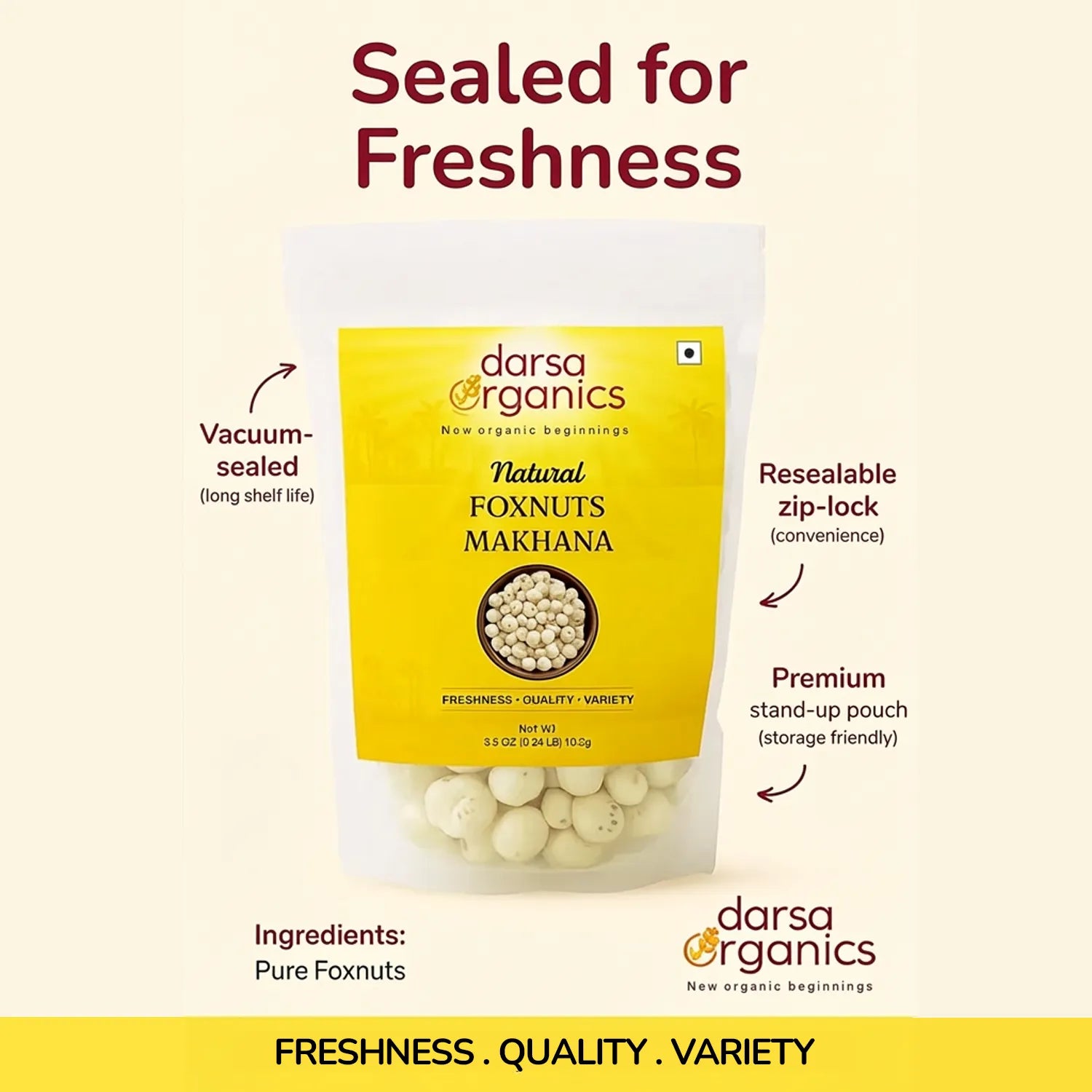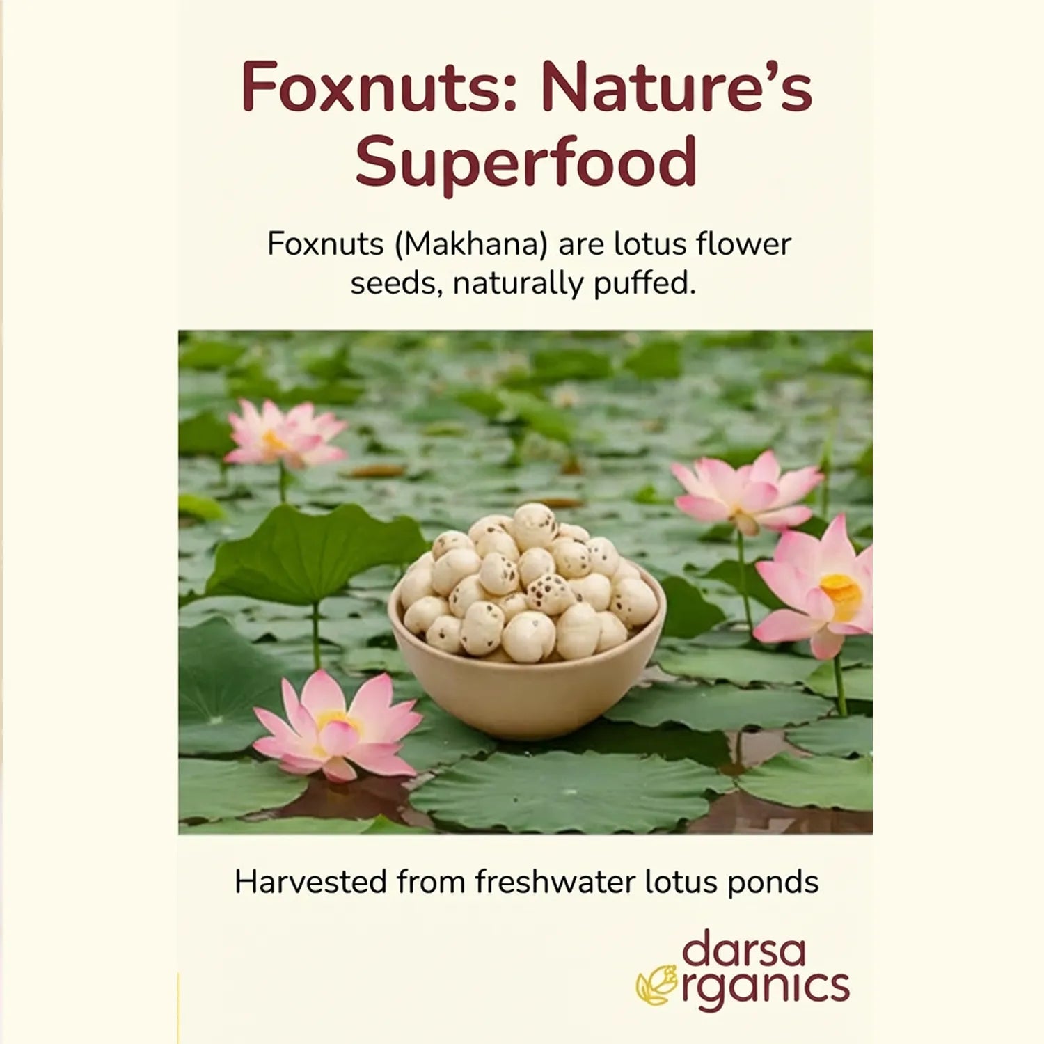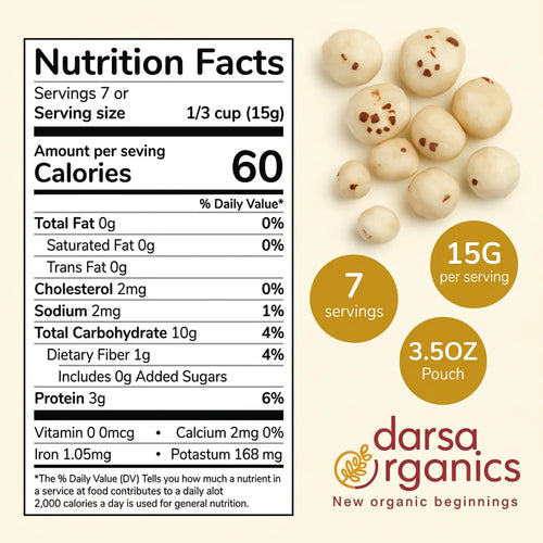 Our premium foxnuts are carefully sourced and hygienically packed to preserve their natural freshness, crisp texture, and delicate flavor. With no artificial additives or preservatives, they deliver a clean, authentic snacking experience you can trust. Foxnuts are low in calories and fat, yet rich in plant-based protein, dietary fiber, magnesium, and antioxidants, helping support balanced nutrition and everyday wellness. Their light, airy crunch makes them highly satisfying without the heaviness of processed snacks, making them ideal for weight-conscious diets, fitness routines, and active lifestyles. Versatile and easy to use, these lotus seeds can be roasted with spices for a delicious roasted makhana snack, added to curries, kheer, trail mixes, salads, or soups, or enjoyed plain as a guilt-free snack. Whether you’re seeking a healthy alternative to chips and popcorn or a traditional superfood with modern appeal, Darsa Organics Pure Foxnuts deliver quality, taste, and nutrition in every bite.